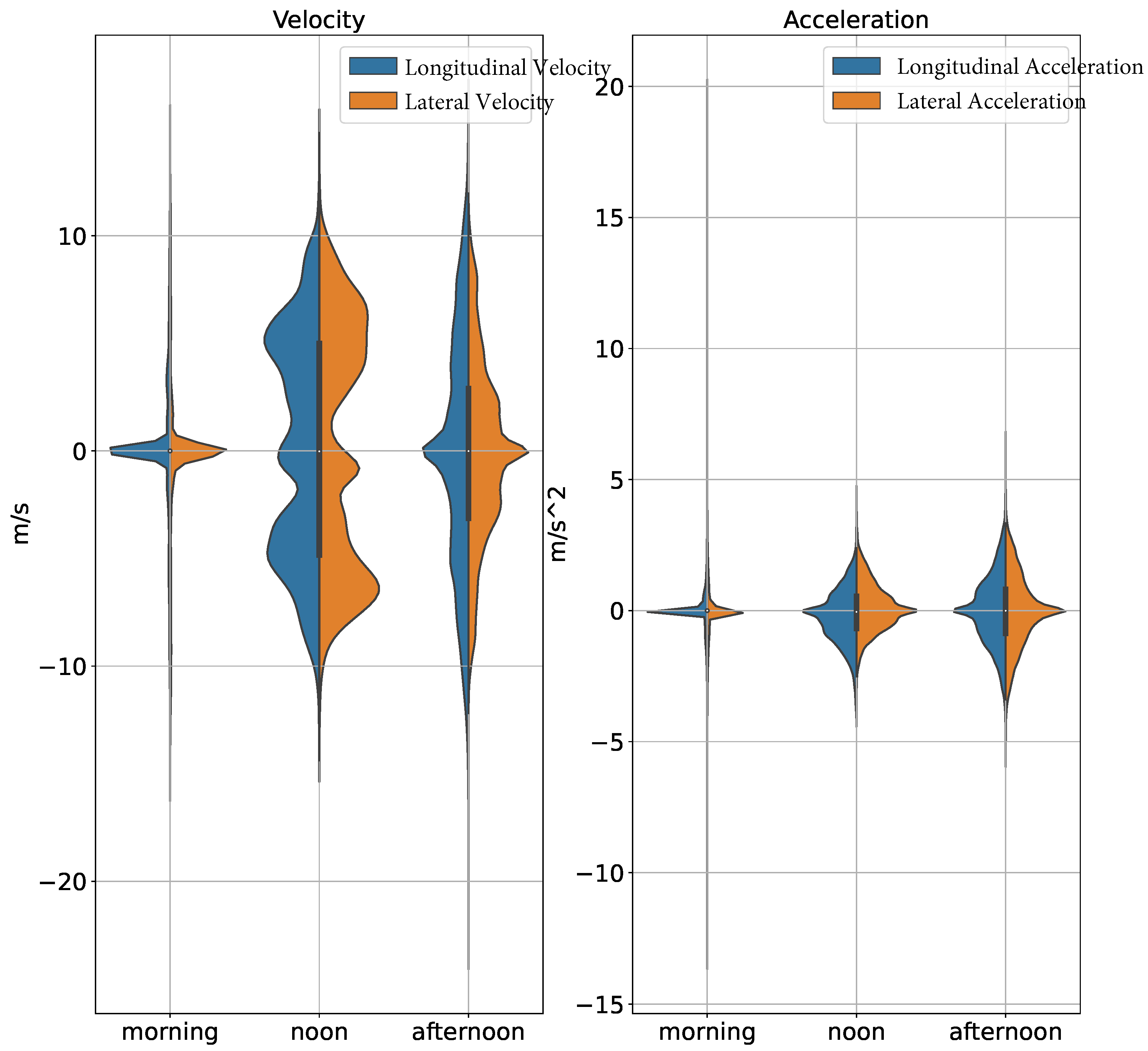 Comparison of morning and afternoon driving behaviors: wider velocity and acceleration ranges are observed in the morning, indicating more aggressive, stop-and-go driving. Noon and afternoon driving shows higher velocities but more consistent, relaxed acceleration patterns.
