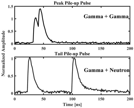 Pile-up pulses can be categorized into two types based on their effects on pulse amplitude: tail pile-up and peak pile-up. Tail pile-up refers to the occurrence where a subsequent pulse overlays the falling edge of a preceding pulse. Given that the falling edge of a pulse may persist for an extended period, tail pile-up can occur even under conditions of relatively low count rates [40]. Peak pile-up, the second type, happens when the interval between two adjacent pulses is too short, causing the neutron detection system to process these two pulses as a single pulse. A slight overlap results in a combined pulse with an amplitude slightly less than the sum of both. Peak pile-up not only leads to recorded spectral distortions, including accidental superimposed peaks, but also interferes with quantitative measurements made by assessing the full peak area of the energy spectrum. Figure 2 illustrates pulse pile-up simulated based on a mathematical model of the pulse, showcasing both types of pile-up scenarios.