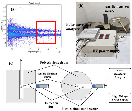 As shown in Figure 3a, the scatter plot obtained by the CCM for neutron-gamma discrimination is displayed, where larger integral values represent neutron pulse signals and smaller values indicate gamma pulse signals. The section marked with a red box highlights the individual neutron/gamma training pulse data used in the pulse pile-up correction experiment, with a detailed discussion provided in Section 3. Figure 3b shows the experimental setup, and Figure 3c illustrates a schematic of the experimental arrangement.