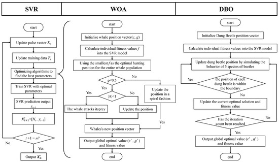 Flowcharts for SVR, DBO-SVR, and WOA-SVR.