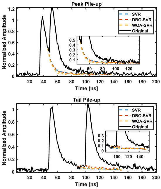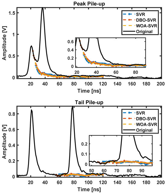 The pulse pile-up correction results based on plastic scintillators as shown in Figure 9. The inset zooms into the critical region highlighting how each algorithm predicts the waveform. DBO-SVR and WOA-SVR show a closer approximation to the original waveform’s tail after the main peak compared to SVR, suggesting they might be preserving the waveform integrity more effectively while minimizing the peak distortion caused by the pile-up. In the trailing edges of these peaks, DBO-SVR and WOA-SVR demonstrate a more effective reduction in the tailing artifacts, maintaining waveform shape more faithfully compared to SVR, which shows slight deviations from the original waveform. Overall, the DBO-SVR and WOA-SVR algorithms appear to perform better in correcting both types of pile-ups, effectively reducing the distortions and preserving the original waveform’s characteristics more closely than SVR.