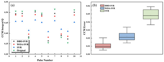 High accuracy in pulse shape is essential for effective neutron-gamma pulse shape discrimination. When processing pulses, it is crucial to restore the original pulse shape accurately. Additionally, CCM provides a comprehensive assessment of pulse shape quality, further supporting discrimination accuracy. As shown in Figure 6, the CCM values and their error bars from simulated test data indicate that DBO-SVR restores pulses best, with the least error in CCM values. Additionally, it was noted that the CCM values are generally lower with SVR predictions than the original pulses, suggesting that the predicted pulse’s falling edge is lower and more prone to local optima.