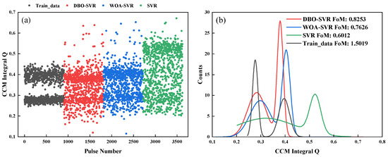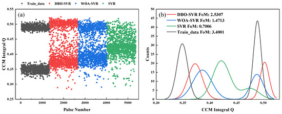 Figure 7a shows a scatter plot for discrimination, and Figure 7b presents statistical FoM figures. The final FoM figure indicates that the information loss caused by pulse pile-up is difficult to restore, with DBO-SVR providing the best pulse correction effect, and SVR barely able to distinguish between the two types of pulse particles.