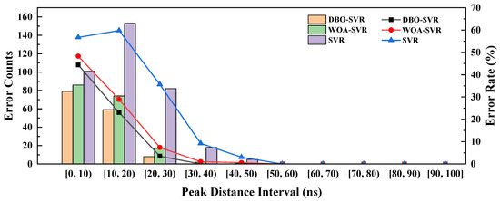 Table 2 presents the correction statistics for four different types of pulse pile-up combinations, corrected by three distinct algorithms. For the + combination, WOA-SVR and DBO-SVR demonstrate superior performance compared to SVR, particularly noticeable in the 10–20 ns to 30–40 ns intervals where their corrections are closest to the total occurrences. Both algorithms manage to sustain high correction rates up to the 80–90 ns interval, showcasing robust consistency in handling + pile-ups.