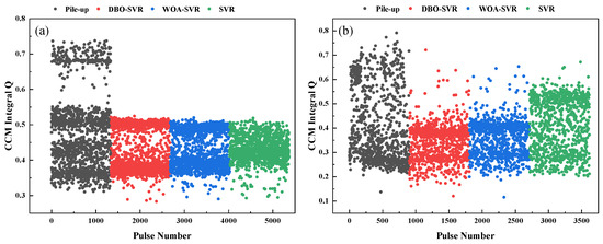 Figure 11 illustrates the effectiveness of different pulse pile-up correction algorithms, distinguishing between simulated data in Figure 11a and experimental data in Figure 11b, based on CCM values across various pulses. In Figure 11a, the data points are grouped into four distinct categories representing the simulated pile-ups before correction and the results after applying three different correction algorithms: SVR, DBO-SVR, and WOA-SVR. The uncorrected pile-up data points, shown in gray, are dispersed widely, reflecting substantial variability in CCM values due to overlapping pulses. In Figure 11b, which displays experimental data, a clearer improvement in data segregation is evident after correction. The pulses corrected by DBO-SVR, WOA-SVR, and SVR form more compact clusters compared to the pre-correction scenario. This improvement suggests that each correction method effectively reduces variability and aligns the CCM values more consistently, with DBO-SVR showing particularly tighter clustering. This indicates a superior ability of DBO-SVR to mitigate the effects of pulse overlap, preserving the integrity of pulse information more effectively than WOA-SVR and SVR. This distinction between simulated and experimental data highlights the practical application and validation of these algorithms in real application.