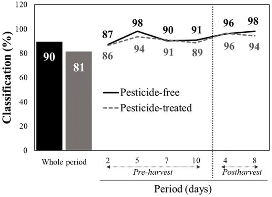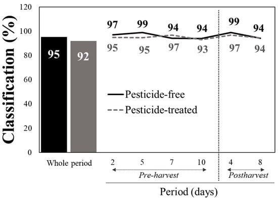 Classification rate (%) of pesticide-free and pesticide-treated baby lettuce leaves based on reflectance spectra data (340–2500 nm) within each day of pre-harvest production or postharvet storage, as well as average means for the whole period upon pooling the data of all individual days.