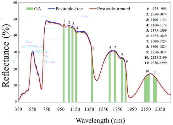 Spectra reflectance (%) of pesticide-free (blue line) and pesticide-treated (red line) baby lettuce leaves in the vis-NIR part (340–2500 nm) as average means for the whole period upon pooling the data captured in all individual days. The eleven green areas represent the parts of the spectrum that exhibited the most significant effect on the partial least squares discrimination analysis classifier and were detected using the genetic algorithm (GA).