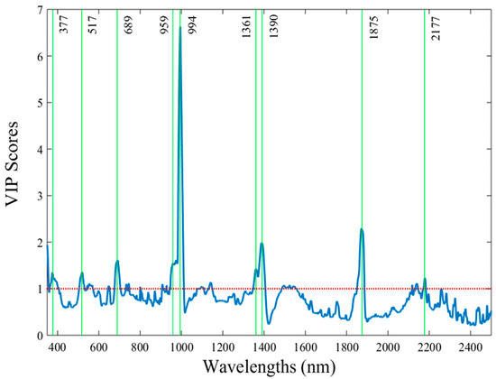The variable importance in projection scores (VIP) in the vis/NIR part (340–2500 nm), which represents the individual effect of each wavelength on the partial least squares discrimination analysis classifier. The vertical green lines correspond to the wavelengths with the highest VIP scores. The red dot line corresponds to the lowest limit above which a wavelength exhibits a significant effect in the discriminant analysis algorithm.