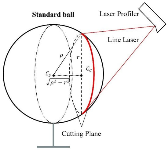 Here, is the radius of the sphere, and the sign of is determined by the relative position of the line-structured light sensor and the standard sphere.