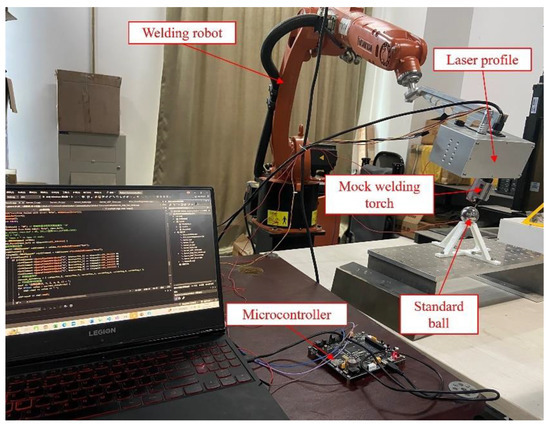 In the hand–eye calibration experiment, a calibration tool—hereinafter referred to as the “simulated welding torch”—was employed to replicate the operation of an actual welding torch. A standard stainless-steel ball, with a diameter of 40.00 mm ± 0.01 mm, was securely positioned within the workspace of the robotic arm’s vision guidance system. According to the calibration procedure detailed in Section 2.1, the robotic arm was first controlled to measure the standard ball 10 times using the line-structured light sensor, restricting movement to translation only. Subsequently, the robotic arm measured the standard ball another 10 times using the line-structured light sensor from arbitrary poses [17]. During these measurements, to prevent singularities in the calibration algorithm, variations occur along the , , and axes of the base coordinate system were ensured when translating the robotic arm. When the robotic arm adopted arbitrary poses, all six joints exhibited variation. Finally, the hand–eye matrices and were determined: