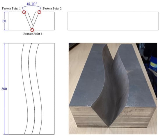 To verify the accuracy of the proposed algorithm for detecting weld seams and guide welding in the thick plate welding, an S-shaped trajectory V-groove welding piece was designed and manufactured, as shown in Figure 4. This V-groove welding piece had a thickness of 60 mm, a length of 300 mm, and a groove angle of 45°.