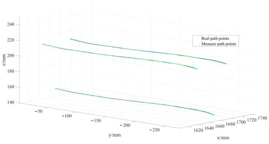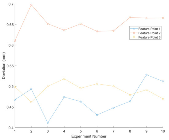 By comparing all V-groove weld seam feature points detected by the sensor during tracking with the actual weld seam trajectory, as illustrated in Figure 5, the average absolute trajectory error was determined. Figure 6 presents the deviations between the measured and actual values of the trajectories for the three feature points across ten measurement sessions. The average errors for the weld seam trajectory were 0.4567 mm for feature point 1, 0.6374 mm for feature point 2, and 0.4856 mm for feature point 3, as detailed in Table 2. These errors meet the application requirements for effective weld seam tracking.