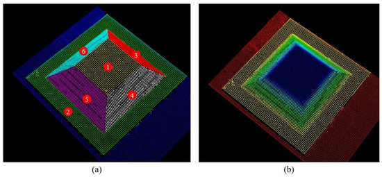 To further validate the generalizability of the algorithm, a regular boss with a dimensional accuracy of 0.01 mm was designed as the evaluation object. The calibrated robot and the laser vision sensor were then employed to perform the 3D reconstruction. Different numerical labels were assigned to each plane of the boss, as depicted in Figure 7. The results of scanning and reconstructing the boss using the line-structured light sensor are shown in Figure 8a. The point cloud quality is high and meets the evaluation requirements. Additionally, the point cloud of the boss was segmented into planes, each assigned different colors to distinguish the planes corresponding to the numerical labels, as shown in Figure 8b.