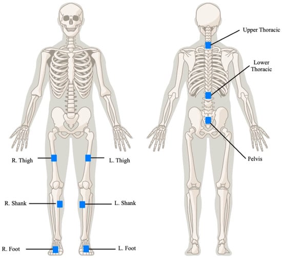 To quantify trunk joint angles during participant-assisted transfers using both the mechanical floor lift and the PPTS, we needed to accurately track participant movement throughout the transfer process. We used Noraxon inertial measurement units (IMUs) to capture motion data. IMUs integrate tri-axial accelerometers, gyroscopes, and magnetometers to compute relative orientation in three-dimensional space. Through sensor fusion, IMUs provide minimal drift orientation data, which can be used to derive joint angles. A systematic review demonstrated that IMUs show a root mean squared error (RMSE) of less than 2.4° when compared with the gold standard (optical motion capture), with intraclass correlation coefficients (ICCs) greater than 0.84, indicating high accuracy and reliability for measuring low back movements [35,36,37]. IMUs have shown excellent validity and reliability in dynamic scenarios, such as those requiring fast trunk movements [36]. Sensor placement followed the Noraxon’s user guide. Figure 1 illustrates the IMU placements.