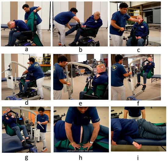 Next, participants were taught to attach the sling straps to the cradle kit of the Hoyer lift, using longer straps for the upper body to reduce chest pressure and medium-length straps for the legs, after crossing the two ends of the sling (Figure 2c,d). They were then shown how to engage the hydraulic lift by turning the knob clockwise and operating the hand crank to lift the user into suspension (Figure 2e). Once the user was suspended (Figure 2f), participants were directed to move the lift toward the bed (or wheelchair) and lower the user gently by turning the knob counterclockwise (Figure 2g) and unhooking the sling strap. Removing the sling involved a multi-step process. Participants were instructed to first lift the legs of the surrogate to remove the foot portion of the sling. Then, they were asked to roll the surrogate onto one side, allowing them to fold and tuck the sling under their body (Figure 2g). After securing the sling in this position, the surrogate was rolled onto the other side, enabling participants to carefully pull the sling out from underneath their body (Figure 2h,i). The participants were instructed to follow similar steps in reverse for transfers from bed to wheelchair.