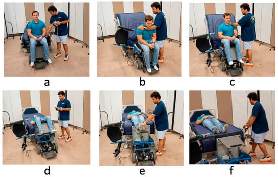 Participants were instructed to press the “transfer to bed” option on the touchscreen controller to begin the process (Figure 3a). They were asked to lean the surrogate wheelchair user forward to create enough clearance for the wheelchair’s backrest to swing away as the bed rose simultaneously (Figure 3b). As the seat rotated toward the bed, participants were guided to gently rest the surrogate’s back into the bed with the lower portion of the bed acting as a backrest (Figure 3c). The bed was then lowered, placing the surrogate in a supine position (Figure 3d). At this stage, a conveyor belt over the mattress started rotating toward the headboard while participants continued holding the transfer button on the touchscreen controller (Figure 3e). The bed elevated to ensure a smooth transfer of the surrogate’s feet. Participants were instructed to assist with leg orientation by supporting or repositioning the legs during this phase (Figure 3f). Once the conveyor fully transferred the surrogate’s feet onto the bed, participants were directed to release the “transfer to bed” button, completing the transfer.