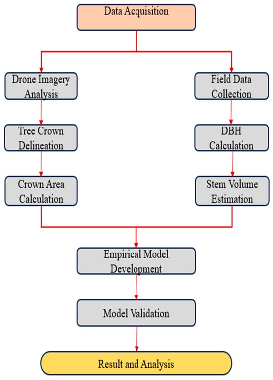 This study followed a phased approach, starting with tree crown delineation and area estimation using drone imagery, followed by stock volume estimation through allometric equations and empirical modeling. An overview of the methodology is shown in Figure 1. Tree canopies were extracted from UAV RGB data in two steps: image segmentation based on object bounding box and class and box offset using Detectron2. Ground data and extracted features were used for stock volume and AGB estimations, along with validation.