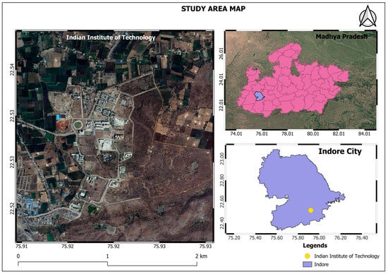 Study area location map. This map shows the study area of the Indian Institute of Technology, which is situated in Indore city in the state of Madhya Pradesh.