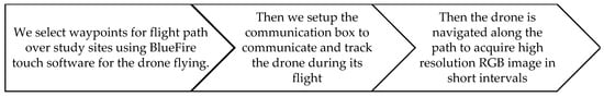 The datasets used in this study included RGB images taken with a Sony ILCE-5100 camera that were captured by a flying UAV Ryno-Lite Surveying Mapper. The data acquisition process using drones is outlined in Figure 3. The UAV was flown at an altitude of 100 m above ground level, providing an optimal balance between spatial resolution and coverage area. The sensor had a 16 mm focal length, with compact dimensions of 62 × 22.5 mm, and a lightweight design of 67 g. The drone was equipped with a communication box that enabled real-time communication (Figure 4) and precise location tracking. With an optimal operational range, the drone covered the study area in 3 flights.