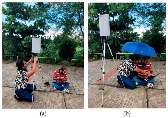 Data collection using the drone. The figure (a) shows the setup of the communication box for the real-time tracking of the drone. Figure (b) shows the flight planning using BlueFire Touch software of v4.1.9047.1979 for the drone. During this stage, the waypoints for the drone flight were decided.