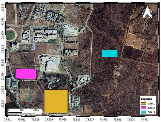 This study was conducted at the Indian Institute of Technology Indore (Figure 2), Madhya Pradesh, India, located at 22°31′21″ N and 75°55′48″ E, with an elevation of approximately 600 m above sea level. It falls in the western part of Malwa plateau. The study site experiences a tropical wet and dry climate, with distinct seasonal variations. Temperatures range from a low of 2 °C to a high of 41 °C. Annual rainfall is approximately 1600 mm, primarily occurring during the southwest monsoon. IIT Indore has 198 acres of forest land that features a range of tree species, including Teak (Tectona grandis), Neem (Azadirachta indica), Mango (Mangifera indica), and Banyan (Ficus benghalensis), providing an ideal environment for aerial remote sensing to assess tree cover. The vegetation in the study area included dense Teak wood (Tectona grandis), which is well known as a woody material with various uses due to its high quality and natural durability [28].