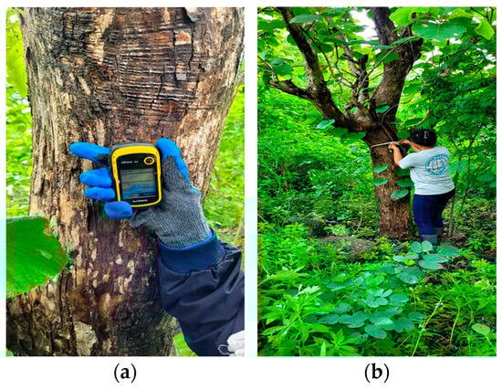 Field work performed for collecting DBH values. Figure (a) shows the geographic location data collection carried out using GARMIN eTrex 10, and Figure (b) depicts the DBH measurement of the tree trunks.