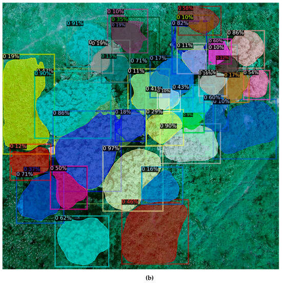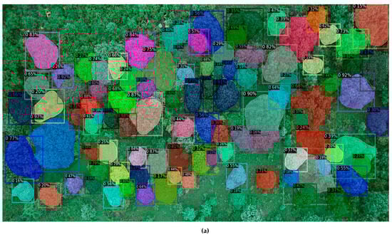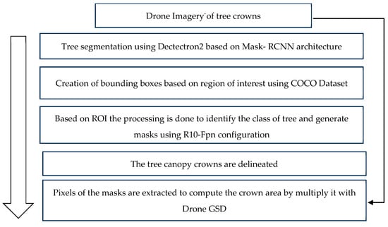 The tree canopies were segmented using the mentioned method based on the drone imagery (Figure 8). Object detection was combined with object segmentation through image segmentation. After an object was detected, a bounding box was generated around the object. Segmentation was carried out to identify those pixels that corresponded to the object of interest. Here, the Detectron2 deep learning model was used, which provided deep learning detection and segmentation algorithms. It is based on Facebook AI’s Mask RCNNN architecture, which is based on the Faster R-CNN architecture, which performs object detection using a Region Proposal Network (RPN). An RPN is a fully convolutional network that is trained end-to-end to generate Regions of Interest (ROIs) for each image. These RoIs were accompanied by object bounds indicating the boundaries of the RoI and the likelihood that it contained an object. The RoIs were then processed through fully connected convolutional networks to identify the class of the object within each bounding box and to produce an exact mask for each object [29]. The Detectron2 computer vision library was used to handle geospatial data and perform the delineation of individual tree crowns. This library executes instance segmentation by generating object ‘masks’ that precisely outline the objects within an image. From “model zoo”, a specific pre-trained model architecture with weights was used, “DetectreeRGB”, in which the R10-FPN configuration was used. This architecture combines a 101-layer-deep ResNet module with a Feature Pyramid Network module. The configuration set the backbone of the network, which is the part that views and extracts features from the scene. Each segmented feature has a confidence score attached to it that relates to how much the network is sure about the object of interest. A suitable threshold was selected to optimize accuracy. The pre-trained dataset used for this work was COCOs (Common Objects in Context), which is a large-scale image recognition dataset used for segmentation, providing 330,000 images as training data [30]. Once individual tree crowns were delineated, their areas were calculated by extracting the number of pixels covered by each crown and multiplying this count by the ground sampling distance of the drone camera sensor, which was 0.025 m.