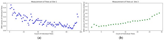 (a) and (b) show the measurement of DBH computed from the filed observations. (a) shows site 1, and (b) shows site 2.