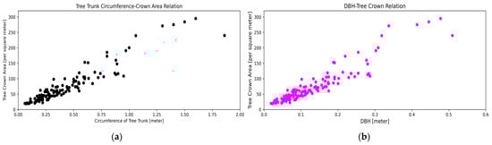 The scatter plot (Figure 11a) represents a positive correlation between the tree crown area and the trunk circumference. For trunk circumferences below 0.25 m, crown areas remain relatively small (0–50 square meters). However, as the trunk circumference increases beyond 0.25 m, the crown area exhibits exponential growth. Between 0.25 and 1.25 m, crown areas range from 75 to 200 square meters. For trees with circumferences exceeding 1.25 m, crown areas typically fall between 250 and 300 square meters.