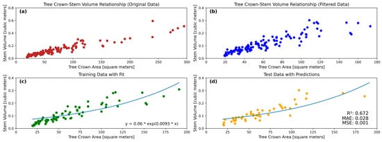 (a) shows the relationship between tree crown and stem volume. (b) shows the crown area data filtered. (c) shows the training data points for the model. (d) shows the testing data points of the model developed.