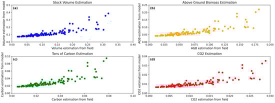 (a) shows the values of stock volume from field measurements on the x-axis and for the model on the y-axis. (b) shows the values of the AGB from field measurements on the x-axis and for the model on the y axis. (c) shows the values of ton carbon from field measurements on the x-axis and the model in the y-axis (d) shows the values of tons/ha CO2 emissions from field measurements on the x-axis and for the model on the y-axis.