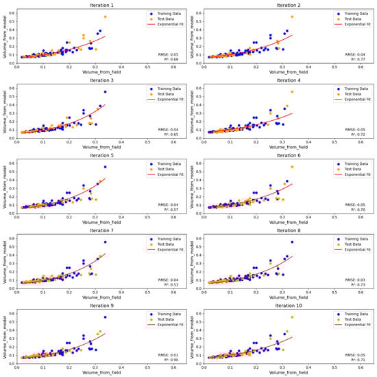 The empirical equations formulated were validated through two approaches. First, for 125 data points with recorded DBHs, we compared volumes computed from conventional allometric equations against those computed with our empirical equation. Employing a randomized cross-validation technique, we segregated the data into 70% training and 30% testing subsets, repeating this process 10 times (Figure 14). The resulting R2 values ranged from 045 to 0.84, showing moderate-to-strong predictive capability across data subsets.