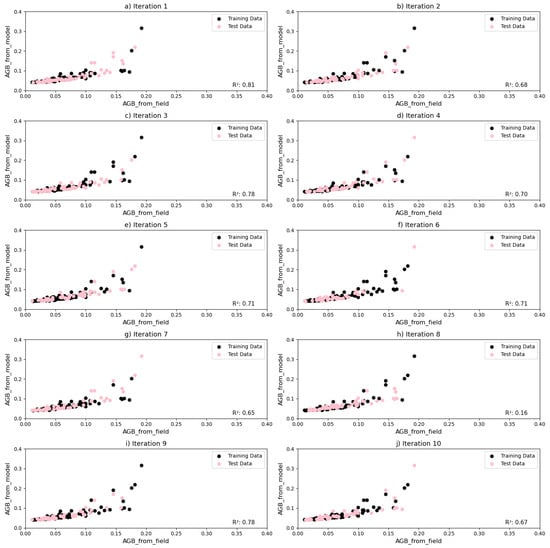 The AGB calculated from the stock volume computed by the model and the AGB measured from the field were also compared. Random iterations were carried out by dividing the dataset into 70:30 ratios for training and testing, respectively (Figure 15). The AGB recorded in the field varied from 0.02 to 0.2 tons per hectare, while the AGB computed from the model was between 0.1 and 0.4 tons/ha. The resulting R2 values ranged from 0.61 to 0.83, indicating moderate-to-strong predictive capability across different data subsets.