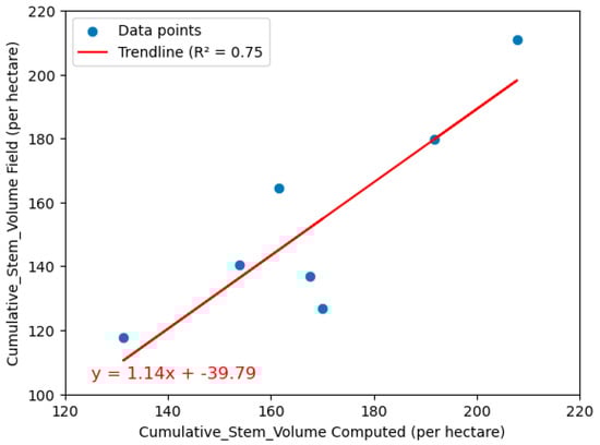 After removing the overestimations and false positives of the tree crown canopies, the model estimated cumulative stock volumes between 190 and 208 cubic meters per hectare, while field measurements for 450 manually measured trees (out of 800 detected by the drone) ranged from 180 to 237 cubic meters per hectare. A strong correlation (R2 = 0.75) was found between the model and field data, with the relationship described by the Equation (2):
