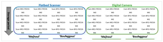Experimental design for frozen date fruit under storage. MEJ: ‘Mejhoul’; BFG: ‘Boufeggous’; FRZ10: freezing at −10 °C; M0: month 0; Cam: camera; Scan: scanner.