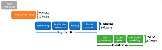 Before classification, color, texture, and morphological features were used as inputs for WEKA software (WEKA 3.9 machine learning software, University of Waikato, Hamilton, New Zealand) to select highly discriminative features based on the “BestFirst” algorithm. Selected features were employed to build classification models according to the “Functions-Logistic” classifier found to be the most accurate compared to other classifiers belonging to the algorithm groups of “Lazy”, “Meta”, “Rules”, and “Trees” (Table 2).