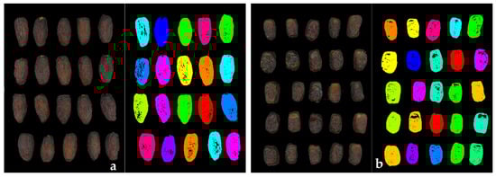 Images with a black background were uploaded to the interface of Q-MAZDA 23.10 software [17] (Łódź University of Technology, Institute of Electronics, Łódź, Poland) to perform image segmentation. Initially, Regions Of Interest (ROIs) were obtained in a Q-MAZDA module automatically by applying predefined image segmentation algorithms practically consisting of three steps: thresholding, morphology adjustment, and splitting. An example of obtained ROIs for the ‘Mejhoul’ and ‘Boufeggous’ cultivars is given in Figure 3.