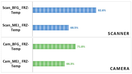 For storage temperature, freezing at −10 °C exhibited a slightly higher prediction level compared to freezing at −18 °C. This trend was observed for both cultivars regardless of the image-capturing device. Overall, higher accuracy rates were obtained by the use of the flatbed scanner as an instrument of image acquisition, by using ‘Boufeggous’ as the date cultivar, and for −10 °C as a storage temperature. By contrast, lower prediction levels were recorded when using the digital camera, the ‘Mejhoul’ cultivar, and a temperature of −18 °C (Table 3). To illustrate the case of the imaging device, the accuracy levels obtained by using the flatbed scanner and digital camera for discrimination between the two storage temperatures at −10 and −18 °C is given in Figure 4. Thus, a respective accuracy rate of 82.6% and 71.8% was recorded for ‘Boufeggous’ images acquired using the scanner and camera. For ‘Mejhoul’, this accuracy was, respectively, 68.5% and 66.3%.