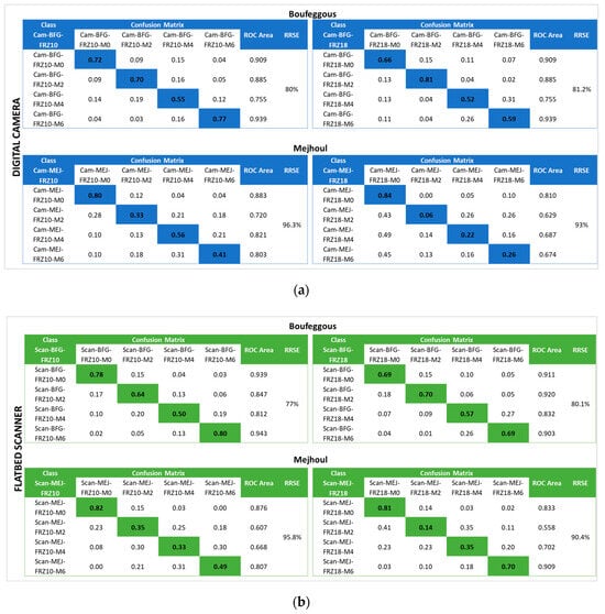 Confusion matrix, ROC area, and RRSE of freeze-stored ‘Mejhoul’ and ‘Boufeggous’ cultivars obtained using a flatbed scanner (a) and digital camera (b).