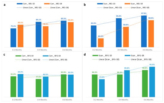 Classification correctness between fresh and freeze-stored date fruit at 2, 4, and 6 months at −10 °C and −18 °C for ‘Mejhoul’ samples acquired with (a) a digital camera and (b) flatbed scanner and ‘Boufeggous’ samples acquired with (c) a digital camera and (d) flatbed scanner.