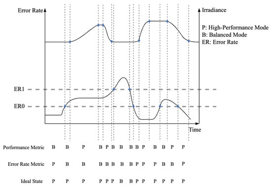 There is no obvious way to distinguish changes in the complex scenarios that make up the PV controller system’s real working environment. It is not feasible to switch the redundant mode directly in accordance with scene switching. In order to guarantee that at least one mode among the several modes will satisfy the scenario’s performance and reliability criteria, the scenario requirements must be precisely studied and quantified so the system can be considered completely applicable to the application scenario. The circumstances within the same scene are always shifting. The hypothetical situation is shown in Figure 2; the modes involved are high-performance and balanced modes. The performance requirements for PV controllers increase when the rate of change in irradiance is relatively rapid. Therefore, the slope of irradiance change is used as a quantitative metric for PV controllers’ performance. When using performance as the sole switching metric, the mode is switched seven times. When using the error rate threshold as the sole switching metric, the frequent fluctuations of error rates in scenarios lead to frequent mode switching with four switches. Utilizing these two metrics as independent sole switching metrics results in high-frequency mode switching, leading to low reliability and affecting the performance of PV controllers. Ideally, we aim for the error rate threshold range and performance to serve jointly as switching metrics. In this ideal state, the number of switches would be reduced to two, achieving a balance between performance and reliability.