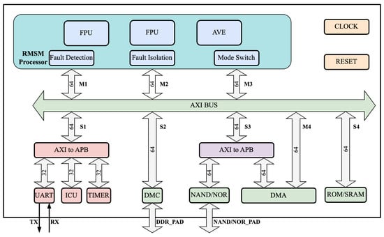 In our work, we have designed a multi-core system that supports a redundancy mode-switchable multi-core processor system architecture. The RMSM processor system designed in this paper includes the RMSM processor and peripheral controller IPs such as DDR, NandFlash, UART, and interrupts. The structure of the RMSM processor system is illustrated in Figure 6. The processor’s external instruction and data interfaces use the OBI (Open Bus Interface) bus. The instruction and data cache front end uses the OBI bus, while the back end uses the AXI bus. The data cache supports configurable write-through/no-write-allocate or write-back/write-allocate strategies. Modules such as fault detection, fault isolation, and mode switching are added outside the core to support lock-step redundancy and mode switchability. Inside the core, checkpoint backup register files and hardware-dedicated DMA are added to the pipeline to support rapid checkpoint backup and recovery.