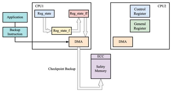 Both regular and backup registers have the same error rates under harsh workplace conditions. This means that if both the architectural and backup registers experience errors at the same time during execution, the processor will be unable to function correctly, leading to continued errors. To address this issue, a software–hardware coordinated checkpoint backup method has been proposed. This method involves setting periodic backup instructions at the software level to back up correct checkpoints to external memory that is isolated from soft errors. To reduce the backup time, a dedicated checkpoint DMA transfer unit is employed to assist in the backup process. The system architecture is shown in Figure 7. At the software level, specialized checkpoint backup instructions are added. In normal operating conditions, the processor continuously performs automatic hardware checkpoint backups internally. When the processor executes the checkpoint backup instruction, the internal DMA transfer module is activated to transfer the backed-up register checkpoint, reg_ff, to the external safety memory for soft error isolation. At this point, the normal pipeline checkpoint backup is paused, meaning reg_f and reg_ff are no longer updated during the DMA transfer process until it is completed. Additionally, since the reg_ff register files transferred by DMA do not interfere with the processor’s active register files, the processor can continue running during the hardware checkpoint backup process. However, during the hardware DMA checkpoint backup period, the processor loses real-time pipeline register recovery functionality. If an error occurs during this stage, the processor will pause and revert to the state set by the last software checkpoint. By using the hardware-dedicated DMA and software-hardware coordinated checkpoint backup method proposed in this paper, the performance overhead caused by software checkpoint backup and the risk of system deadlock due to reverting to an erroneous state is reduced.