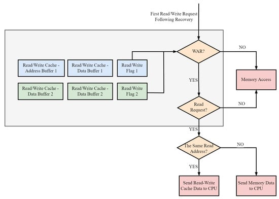 This paper introduces a novel solution that addresses the issue of read-after-write dependency during fault isolation. As shown in Figure 9, the proposed solution involves a cache that not only stores write requests but also caches read requests. The cache is designed to store read and write operations initiated by the processor and is accessed by the bus. In the event of a fault, the cache compares the first read request initiated by the processor with the read address in the read–write cache. If the addresses match, the data are directly retrieved from the cache to ensure accuracy.
