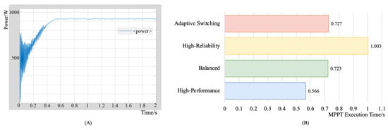 MPPT algorithm execution result. (A) Power tracking curve under high-performance mode. (B) Execution times of different modes.