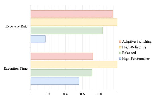 The adaptive dynamics of the recovery system are compared with three single modes, keeping the soft error injection method unchanged. The experimental results are shown in Figure 13. The results show that in the dynamic switching mode, the fault recovery rate decreases compared with the single mode, but remains at a high level. The fault recovery rate decreases compared to that of the single mode but remains at a high level. This is due to the lower fault recovery rate of the dynamic switching mode in high-performance scenarios, which reduces the overall system fault recovery rate. Performance comparisons indicate that system performance remains high in the dynamic switching mode.