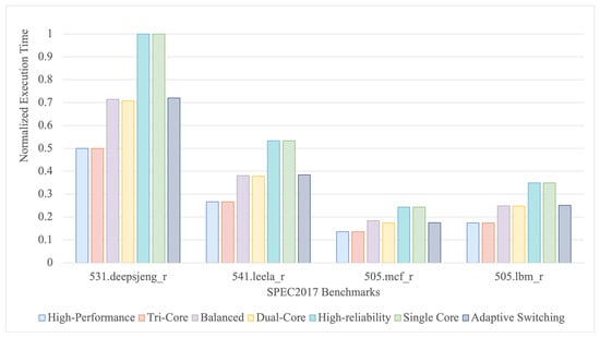 Using these benchmarks, we can effectively simulate the computational, optimization, and real-time response demands of intelligent MPPT algorithms in a PV system. The performance of the proposed RMSM is evaluated by using the gem5 simulator at the RTL level, under both adaptive-switching and single-mode conditions. We compared it against single-core, dual-core, and tri-core configurations without fault tolerance. As shown in Figure 14, the RMSM system demonstrates competitive execution times on benchmarks designed to simulate MPPT algorithms. In particular, it outperforms the high-reliability mode and single-core system without fault tolerance, delivering superior efficiency. Compared with the balanced mode and fault-tolerance-free dual-core system, the RMSM system exhibits similar performance across all benchmarks, except for a slight lag in the 531.deepsjeng_r benchmark. Although the high-performance mode and the fault-tolerance-free tri-core system achieve approximately 40% faster execution times than the RMSM system, our approach offers a significant advantage in terms of reliability, which improves by about 5.58 times. This highlights the superior adaptability and robustness of the RMSM system, especially under dynamic switching conditions, where it effectively balances performance and reliability. By adaptively adjusting core usage and operating mode, the RMSM system achieves near-high performance speeds while substantially enhancing the system’s fault tolerance.
