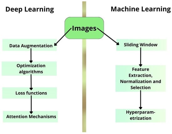 The stages of this work are summarized in the diagram in Figure 1. The methodology adopted in this research combines distinct approaches for both deep learning and traditional machine learning. The machine learning approach begins with a sliding window technique, which is employed to augment the number of images. Subsequently, the data undergo a series of operations, including feature extraction, normalization, and selection, which are collectively designed to prepare and refine the dataset, ensuring that only the most relevant features are used for modeling purposes. The final stage of the process entails the fine-tuning of the algorithmic settings through hyper-parameterization, thereby optimizing the model’s performance. In the context of deep learning, the initial step involves data augmentation, which serves to enhance the training dataset. This is followed by the application of optimization algorithms, which are used to adjust the model parameters to minimize errors in classification. The performance of the model is then evaluated using specific loss functions, which are employed to quantify errors and guide the learning process. Finally, attention mechanisms are employed to focus on the most relevant parts of the input data, thereby improving the model’s accuracy.