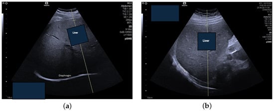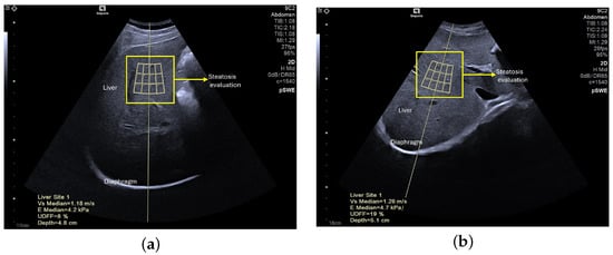 Steatosis, commonly referred to as fatty liver disease (FLD), is defined by the abnormal accumulation of fat within liver cells, specifically when it accounts for more than 5% of the liver’s total weight []. This condition is turning into a significant global health concern, since its prevalence is increasing, with estimates suggesting that 30% of the world’s population is being affected by it []. FLD can be divided into two categories according to its main cause: alcoholic fatty liver disease (AFLD) and non-alcoholic fatty liver disease (NAFLD). Both can originate from lifestyle factors and are strongly associated with type 2 diabetes, obesity, and metabolic syndrome []. When left untreated, NAFLD can progress into more serious liver diseases, such as non-alcoholic steatohepatitis (NASH), fibrosis, liver cancer, or even cirrhosis; this is why an accurate diagnosis is crucial for early intervention and effective management of the condition []. Medical imaging plays a pivotal role in the diagnosis and assessment of steatosis, offering non-invasive methods to evaluate liver fat content and liver stiffness. Since ultrasound is a widely accessible and cost-effective technique that can identify increased liver echogenicity, an indicative sign of steatosis, it is the main imaging modality used to detect FLD. However, elastography has emerged in this field, offering advanced assessment by measuring liver stiffness, which correlates with fibrosis and inflammation levels [].