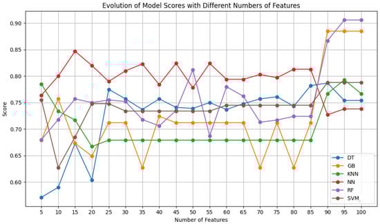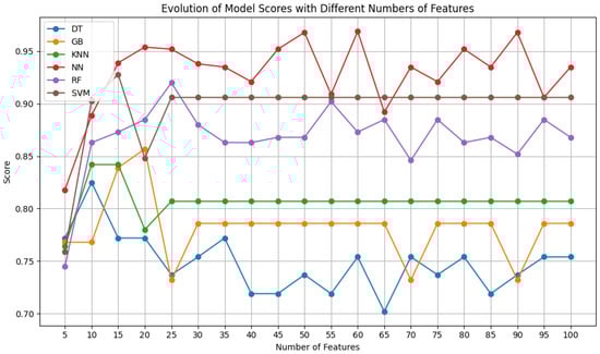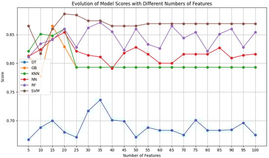 After obtaining the best possible parameters through hyperparameter optimization, the performance of each classifier was compared for several features between 5 and 100, in increments of 5, using the SelectKBest feature selection algorithm.